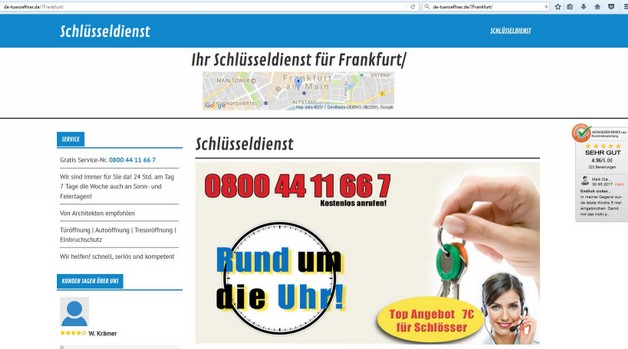 de-tueroeffner.de - das ist eine von vielen Homepages des Thomas Mannstaedt aus Regensburg, der es damit unter vielen Orten Deutschlands auf seiner Homepage so aussehen lässt, als sei seine Firma "vor Ort" ansässig - hier ein Beispiel für Frankfurt am Main: